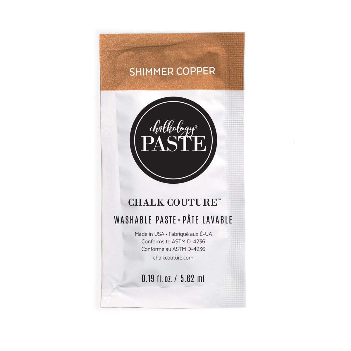 Make a statement with creamy dreamy™ Shimmer Copper Chalkology® Paste! Perfect for hard surfaces. It’s washable, forgiving when wet, and offers a hard, matte finish. Chalkology Paste Singles include .19 US fl. oz. Chalkology Paste is formulated for use with Chalk Transfer® designs and Chalk Couture™ surfaces. Can also be applied to other nonporous surfaces.